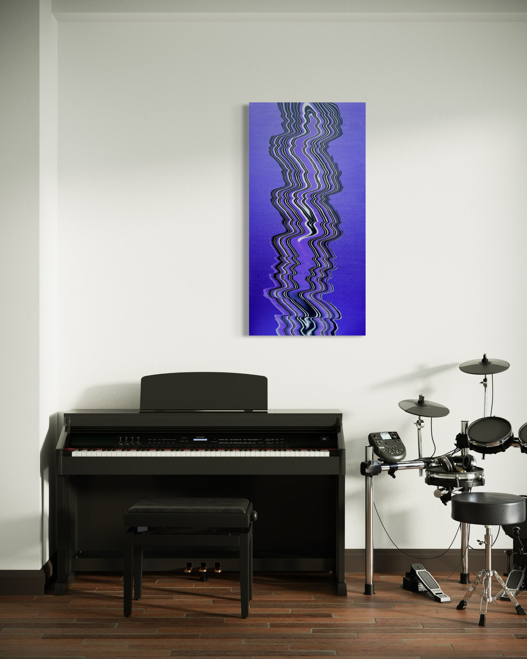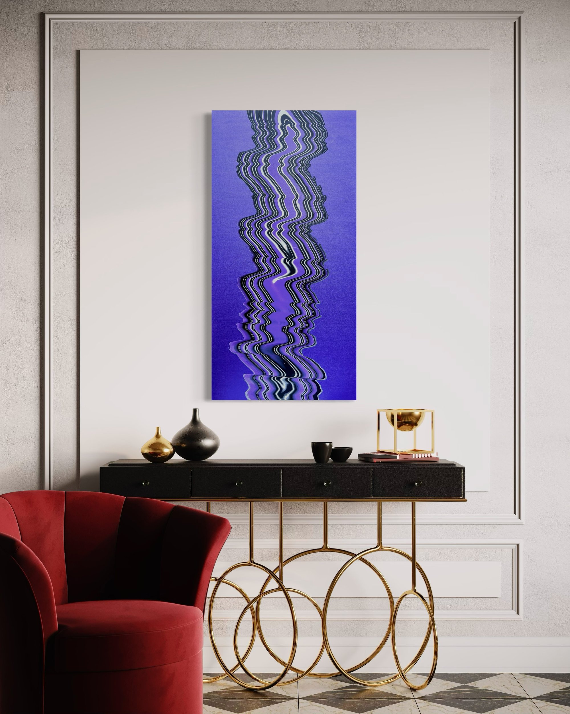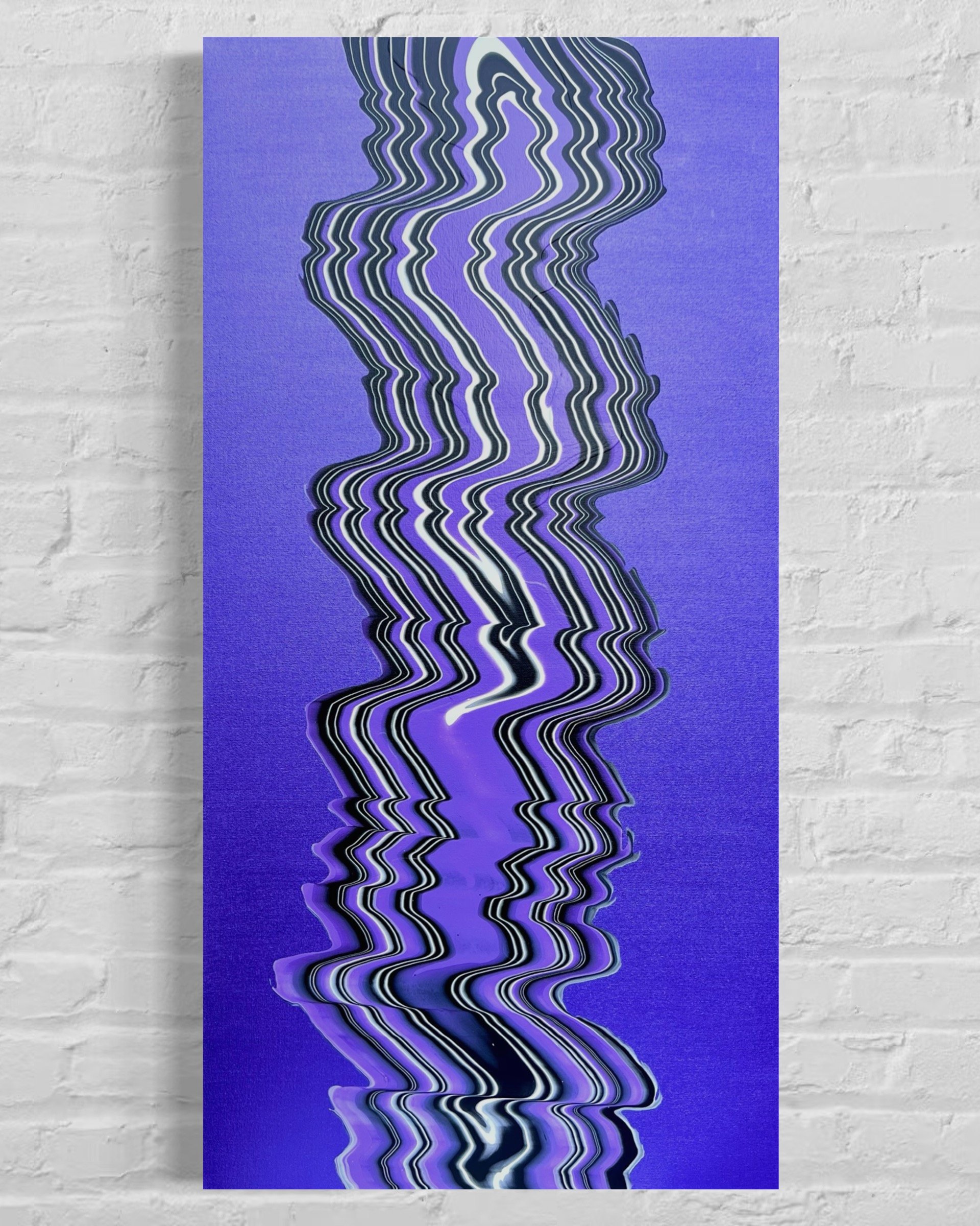 Amethyst Ripple radiates with the deep, luminous shimmer of metallic purple, drawing the eye to a flowing river of black, white, and violet. Like a ripple across a mystical pond, the central stream vibrates with hypnotic energy, creating a mind-bending visual rhythm that feels musical. Inspired by the rich, spiritual essence of the amethyst gemstone, this painting resonates with light, vibration, and the captivating interplay of color. Amethyst Ripple is a celebration of motion, harmony, and the magnetic beauty of rhythmic flow.