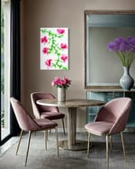 Blush Efflorescence follows the graceful descent of lush leafy vines, adorned with magenta and orange blooms that spiral open in radiant waves. The piece captures the vibrancy of growth and the flowing elegance of nature in bloom.
