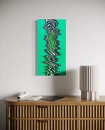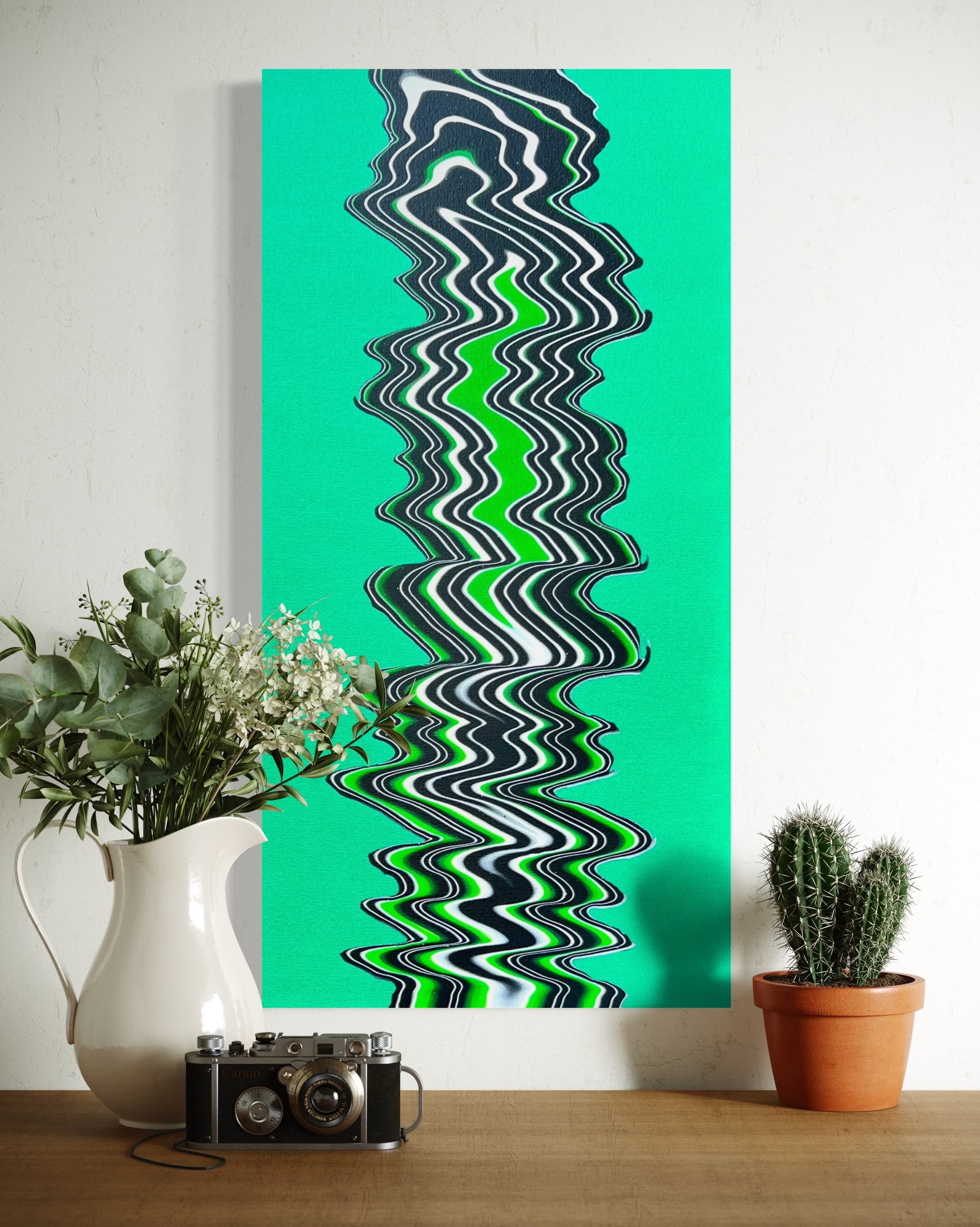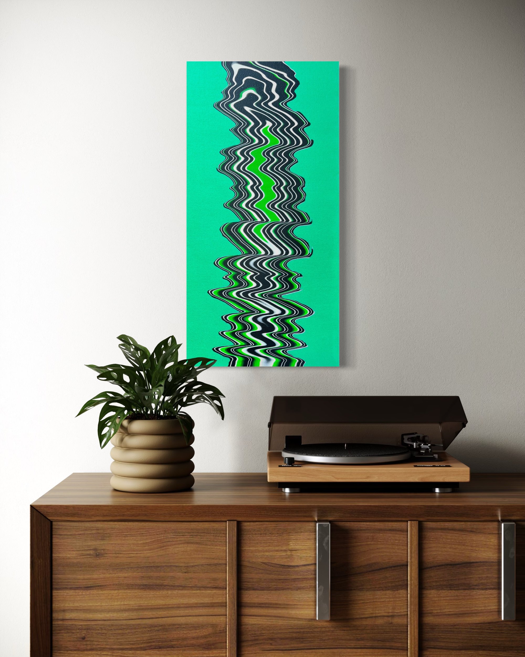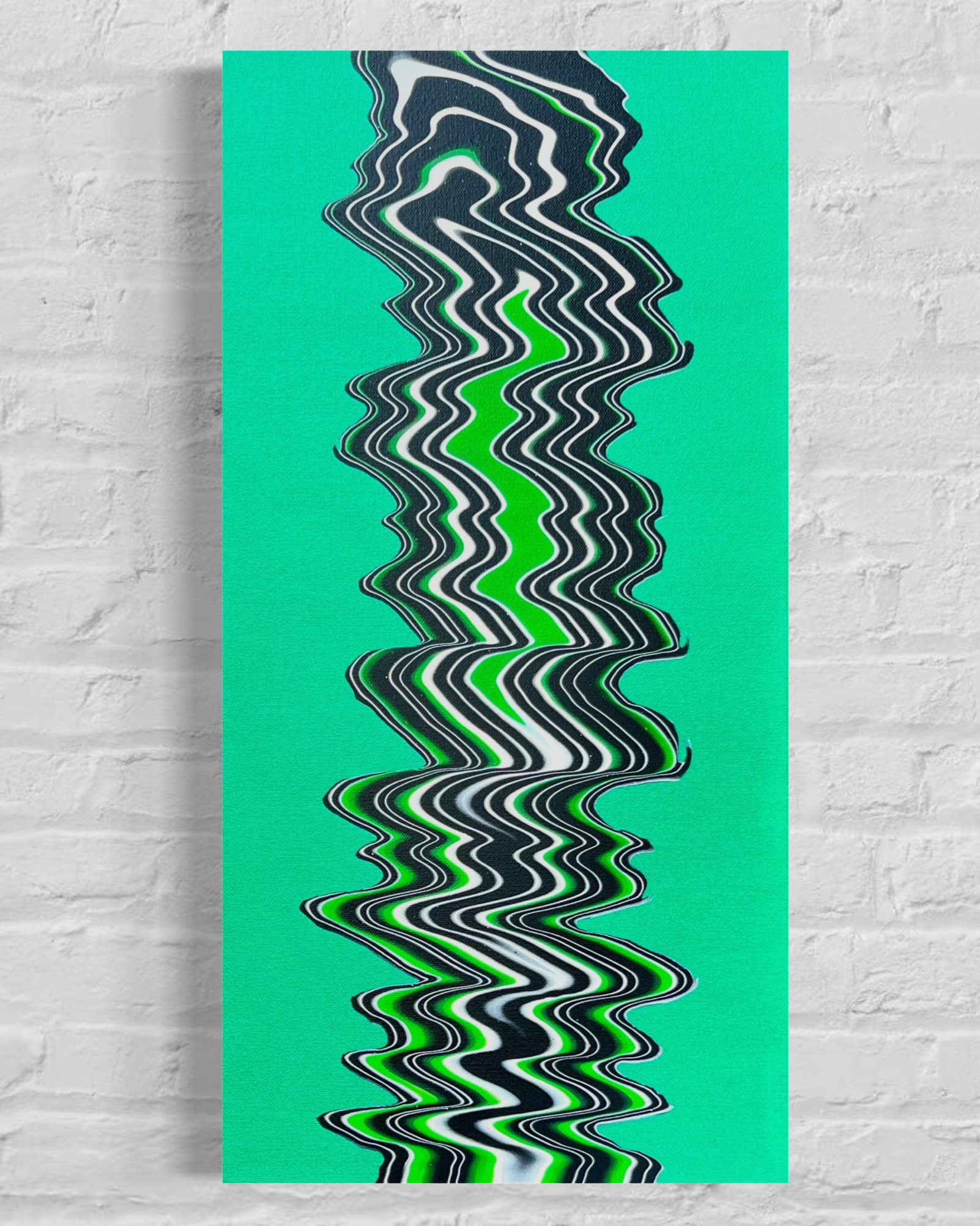 Emerald Chime shimmers like a gemstone come to life. Metallic green dances across the canvas, while a central pulse of black, white, and vibrant green vibrates with a hypnotic, psychedelic rhythm. Like a chime struck by invisible hands, the painting resonates with energy, echoing the harmony and intensity of music made visible. Each angle reveals mind-bending waves and layers, drawing the eye into a symphony of color. Evoking the depth and clarity of the emerald birthstone, Emerald Chime is a celebration of vibration, light, and the mesmerizing beauty of the unseen.