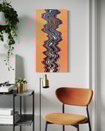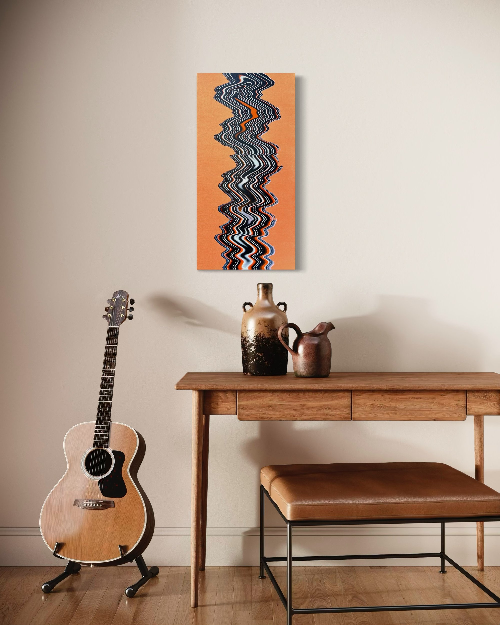 Imperial Topaz Flutter glows with radiant warmth, like sunlight captured in motion. Shimmering waves of black, white, and fiery orange ripple across the canvas, creating a dazzling visual rhythm that feels alive with energy and movement. The rich tones of imperial topaz evoke vitality, confidence, and creative spark, while the hypnotic flow of lines gives the illusion of fluttering wings or dancing flames. Both psychedelic and harmonious, this piece transforms pure vibration into a brilliant display of color and form.