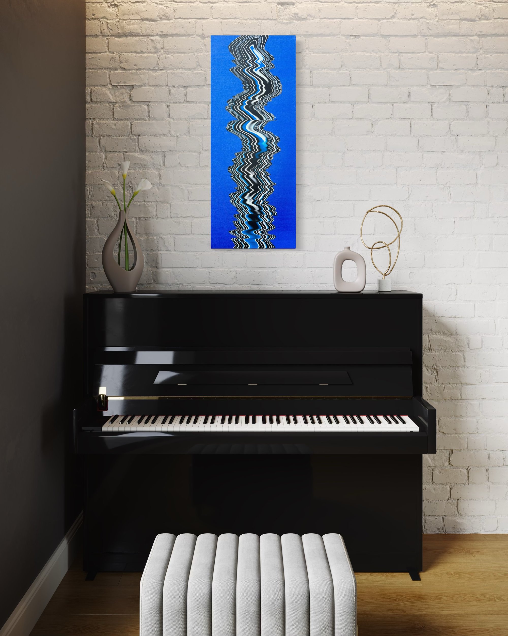 Sapphire Cadence shimmers with cool intensity, like a melody unfolding in waves of motion and light. The flowing currents of black, white, and electric blue ripple across a vibrant sapphire backdrop, creating a hypnotic visual rhythm that feels both psychedelic and soothing. This piece captures the essence of cadence—balanced, fluid, and endlessly shifting—inviting the viewer into a state of harmony and flow. With its gemstone-inspired brilliance and mind-bending optical energy, Sapphire Cadence transforms sound and vibration into pure visual form.